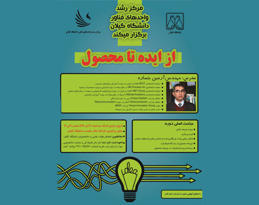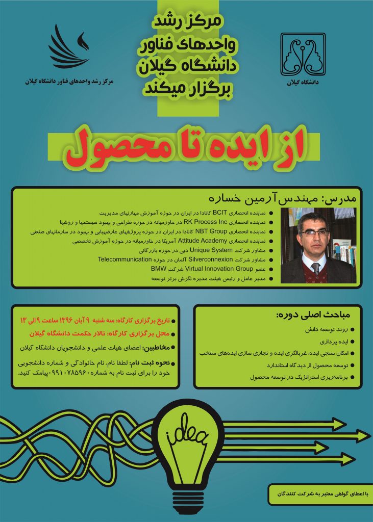 به همت مرکز رشد واحدهای فناور دانشگاه گیلان، در تاریخ ۹ آبان ماه ۱۳۹۶ کارگاه آموزشی "از ایده تا محصول" با ارائه آقای مهندس آرمین خساره در تالار حکمت دانشگاه گیلان به مدت ۴ ساعت برگزار شد. شرکت ­کنندگان در این دوره با مباحثی از قبیل: روند توسعه دانش، ایده ­پردازی، امکان ­سنجی ایده، غربالگری ایده و تجاری سازی ایده ­های منتخب، توسعه محصول از دیدگاه استاندارد و برنامه ­ریزی استراتژیک در توسعه محصول آشنا شدند.